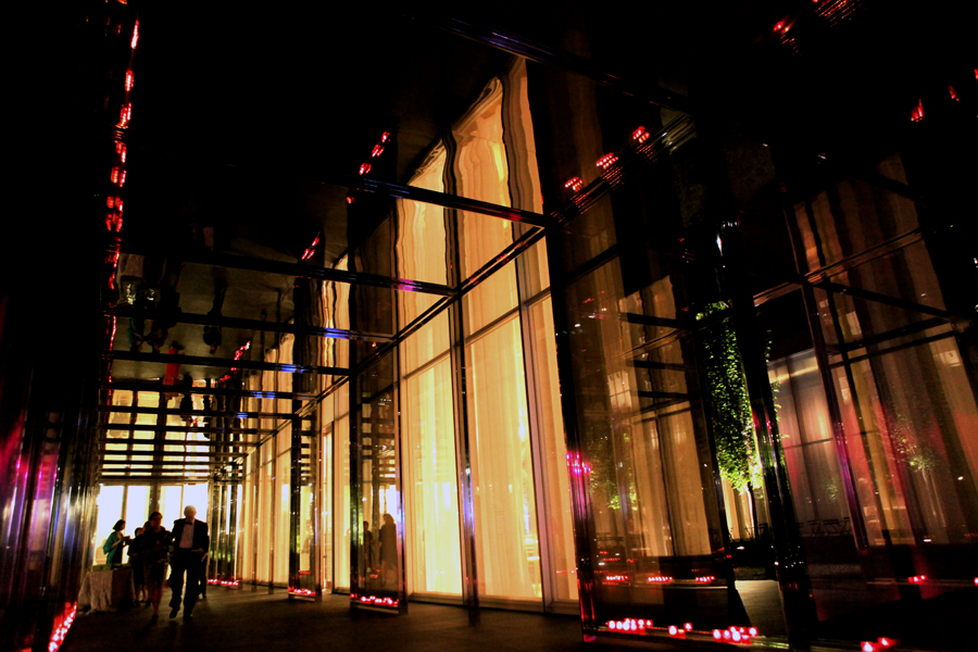 Even at night, the museum’s exterior puts on a subdued light show. The fountains, sculptures, trees, and other surfaces come together to absorb, diffract, reflect, and refract the light coming from the building and on the grounds.