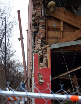 Here’s what happened. Last Friday a city inspector noticed decorative tiles buckling on the historic Rhodes Furniture building at the corner Wilmington and Martin Streets in Downtown Raleigh. A closer inspection revealed that a segment  of structural brickwork had begun to fail. The property owner, Beacon Partners, was notified, and to prevent its collapse into the street, a demo crew was called in to pull down the facade of the weakened building. Below is the scene as it appeared about 10:30 Friday night.